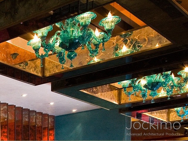 Our 9108 GV antique mirror is utilized on the interiors of the chandeliers on this project. The glass was ordered annealed and cut to size by the installer.