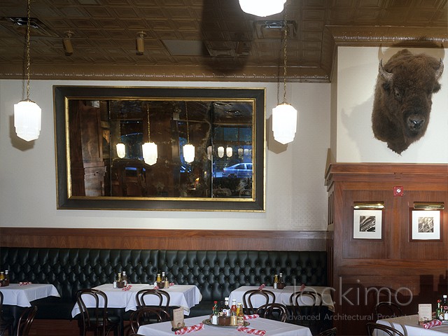 Our Tarnished Distressed MirrorUnique™ glass is utilized in this Time's Square restaurant. Jockimo provided the antique mirror and the frame.