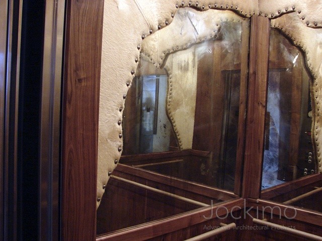 Our Tarnished Distressed MirrorUnique™ antique mirror glass is installed in the elevator cabs of this high end luxury hotel in Savannah, GA.