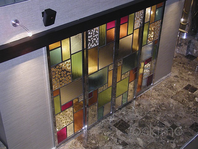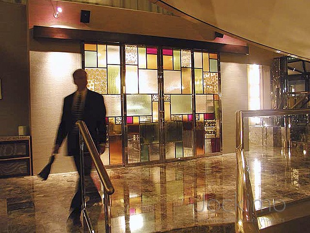 Numerous standard and custom Jockimo textures are used on this hotel project in Mahattan. All panels are cast using colored glass and then laminated for safety. Art niches were provided either silvered or laminated to mirrors to provide more intense colors and reflections of colors. (Note - the color within the glass is not painted - these are the actual glass colors.)